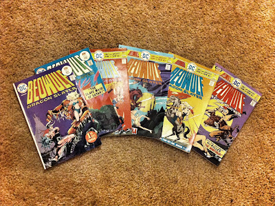 OK, así que el otro día dije que ahora tendría que buscar los números que me faltaban de Beowulf Dragon Slayer (DC, 1975) para completar la colección y hoy resulta que ya los he conseguido todos. Y no me refiero a las versiones de archivo digital, sino a las reales de papel. No es que sea la noticia del siglo ni que vaya a cambiar mi visión del cómic, pero todo tiene su interés. Por ejemplo: cuando yo era pequeño siempre tenía la sensación de que en el colegio tenía una ventaja sobre mis compañeros gracias a leer tebeos. Sencillamente, sabía más cosas. Por ejemplo, qué significaba intrínseco o fetiche, palabras ambas procedentes de mi primer Tintín, La oreja rota. Ahora me pregunto qué habría sabido del poema heroico Beowulf si esta versión superheroizada hubiera caído en mis manos. Porque la progresión de la serie es imparable, y no hay más que revisar las portadas para entenderla.
